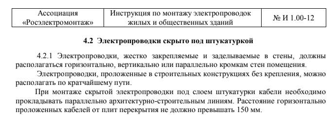 La verticalité, l'horizontalité du câblage domestique est régie par les "Instructions pour l'installation du câblage ..." élaborées par l'Association "Roselectromontazh" - les développeurs ont pris en compte les causes des accidents. Le document porte le numéro I 1.00-12. Une capture d'écran de la section souhaitée était jointe au commentaire.