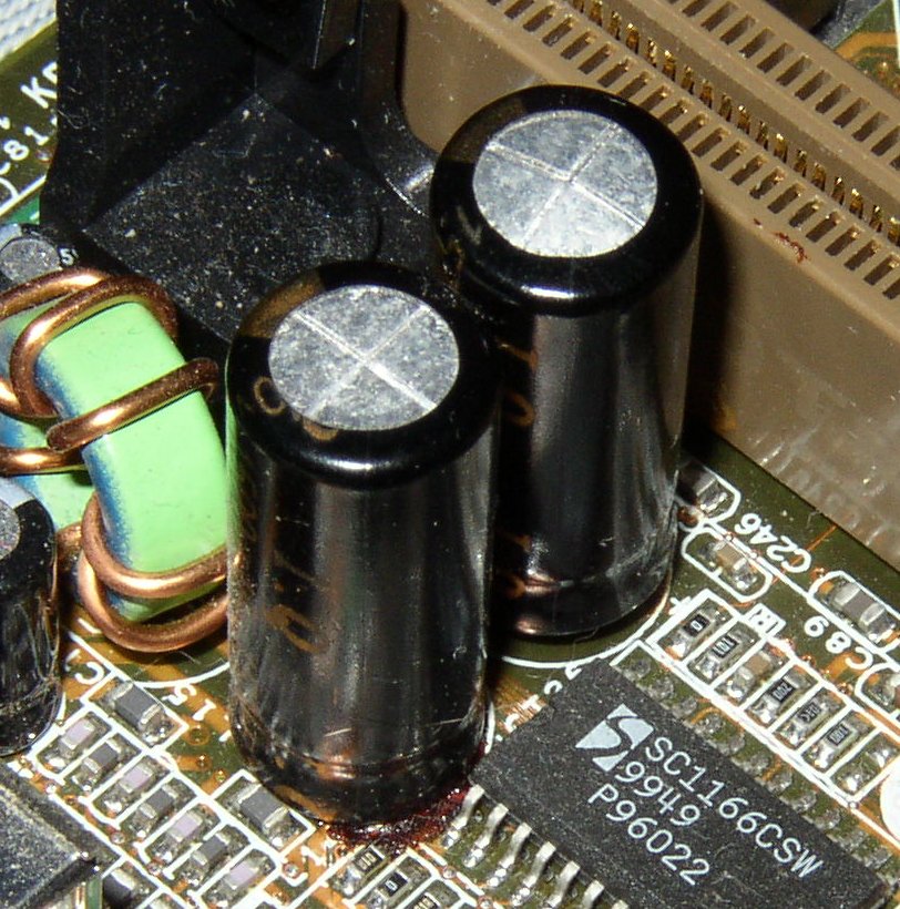 Les condensateurs modernes sur le dessus ont une petite indentation et une croix. L'épaisseur de la partie déprimée est inférieure au reste de la surface du couvercle. Dans l'explosion, sa partie supérieure s'ouvre comme une rose. Pour cette raison, il est possible d'observer un gonflement aux extrémités du corps de l'élément défectueux.