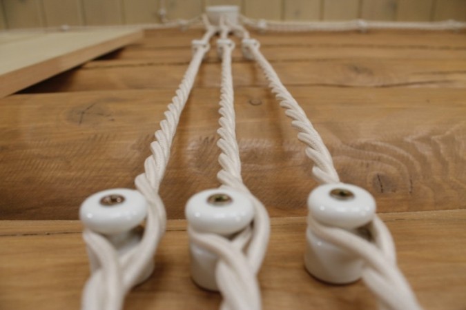 Quelques années après la construction de la maison en bois, elle rétrécit, donc l'affaissement des fils est inévitable. Pour maintenir une apparence agréable des lignes sans suspendre, les fils sont fixés avec des attaches de câbles au-dessus et en dessous des isolateurs.