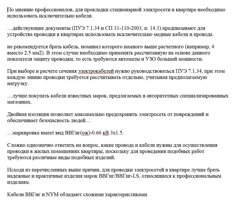 À propos du choix du câble - le texte donne un exemple de décodage de la lettre de marquage du câble, qui est utilisé dans le câblage d'appartement - VVGng (ozh) -0,66 kV 3x1,5. La dernière valeur, je le rappelle, est déterminée par le calcul du réseau. Ce type de câble et vous pouvez choisir.