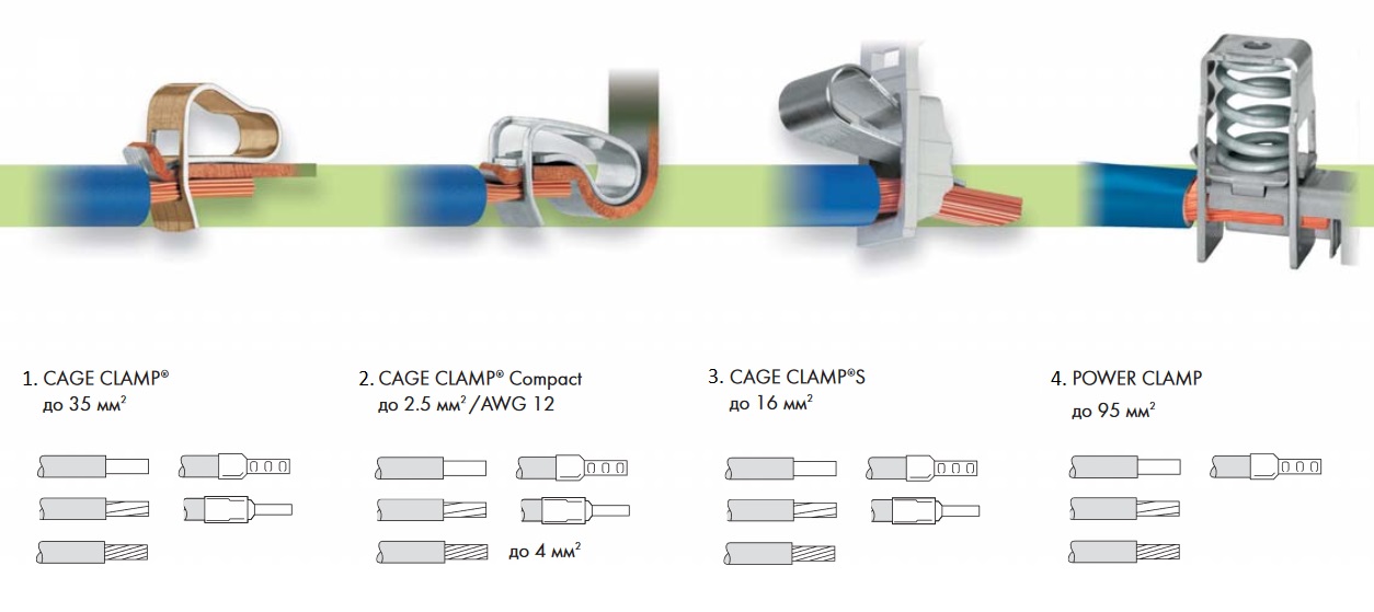 Électrique remarquable terminaux d'entreprise Wago. Les ingénieurs de l'entreprise ont inventé plusieurs conceptions attrayantes, où le terminal ordinaire se transforme en une interface pratique pour la connexion: Fil de poussée, Pince de cage d'alimentation, Pince à cage.