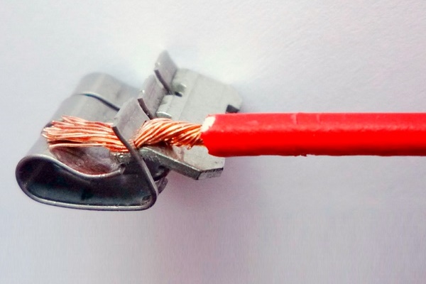 Les extrémités des fils sont insérées à l'intérieur du tube en laiton et les vis de verrouillage (généralement deux vis) sont vissées. À leur tour, les vis pressent le conducteur vers le bas du tube métallique.