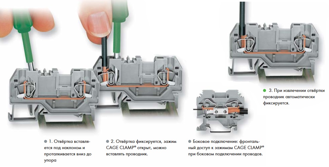 Agit Pince à cage simple: avec un tournevis (ou un levier spécial dans d'autres versions), le clip à ressort est soulevé, le fil est inséré sous le bus de transport de courant, puis le clip est abaissé en place. Ce produit est de type blocs de jonction autobloquants.