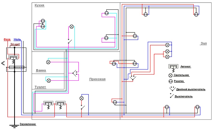 Ce schéma garantit un fonctionnement fiable du câblage électrique dans l'appartement, vous permet d'éliminer les éventuels dysfonctionnements sans supprimer la tension sur l'ensemble du réseau domestique.