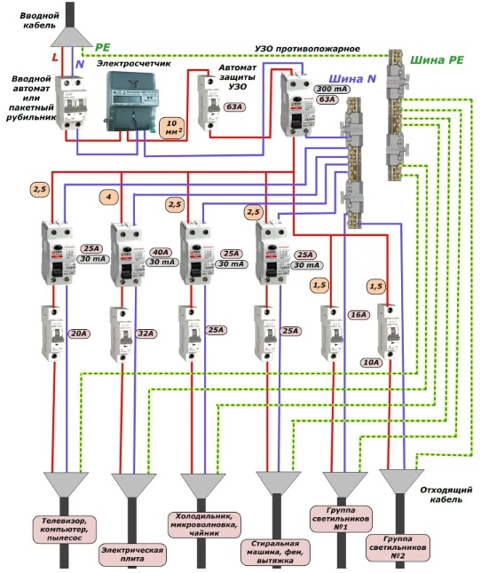 Cela nécessite l'installation non seulement du compteur lui-même, mais aussi installation de disjoncteurscalculé en fonction de la charge - en théorie, la commutation de chaque section fonctionnelle du câblage de l'appartement, comme dans l'exemple ci-dessous: