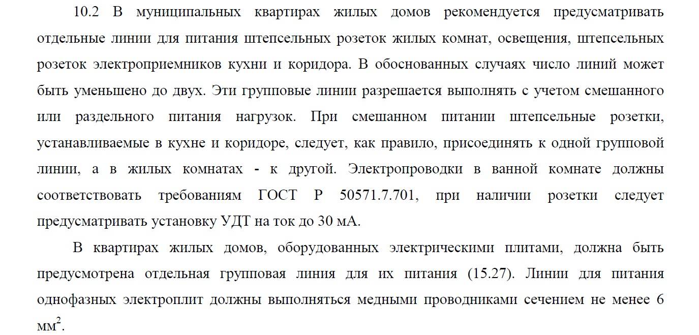 Le seul passage au reste de l'équipement électrique à la maison est une "rentabilité" excessive. Afin de ne pas décrire les exigences du "SP 31-110-2003" "RÈGLES D'INSTALLATION ÉLECTRIQUE DES BÂTIMENTS RÉSIDENTIELS ET PUBLICS POUR LA CONCEPTION ET L'INSTALLATION" ci-joint une capture d'écran du paragraphe correspondant.