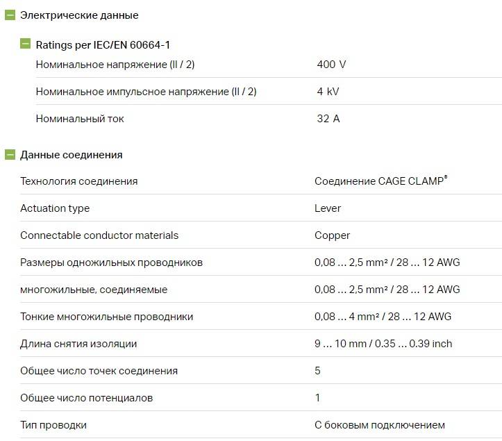 Selon les informations techniques, les bornes auto-bloquantes sont conçues pour fonctionner avec des conducteurs d'une section de 0,08 à 95 mm à des tensions de fonctionnement jusqu'à 1 000 volts. Les paramètres de courant de fonctionnement sont autorisés dans la plage de 6-320A. Le principal domaine d'application est le ménage, mais des produits industriels sont également fabriqués.