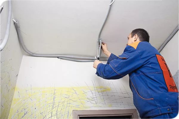 Lors de l'installation du câblage caché, vous devrez abandonner les murs afin que tous les fils soient masqués sous la finition. Plus facile avec les structures suspendues: les tuyaux pour le système d'éclairage peuvent être cachés au-dessus du revêtement de tension ou de la boîte en placoplâtre.