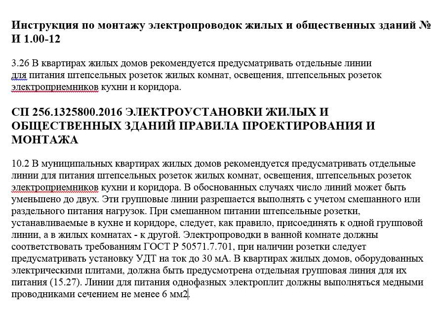 L'alimentation électrique de la salle de bain a contourné les documents réglementaires - cela ne s'applique qu'au circuit d'alimentation électrique des équipements électriques. En d'autres termes, une ligne dédiée n'est pas requise. Cependant, le SP 256.1325800.2016, qui établit les règles de conception des appartements, nécessite de protéger la ligne RCD 30 mA de la salle de bain s'il y a des prises dans la pièce. Sous le RCD, il est logique de poser la ligne sélectionnée. Une capture d'écran combinée des paragraphes mentionnés des documents - ci-joint.