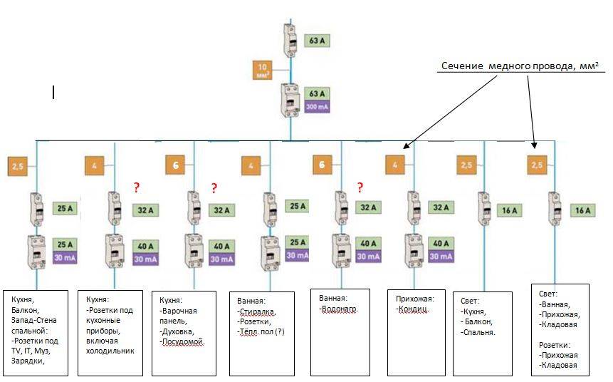 Selon les règles, si les réseaux intra-appartements sont divisés en groupes, chaque ligne individuelle doit être équipée d'une machine automatique de 25 A. Par conséquent, lors de la ventilation en groupes, nous prenons en compte le courant nominal total (pas plus de 25 A).