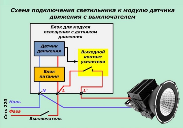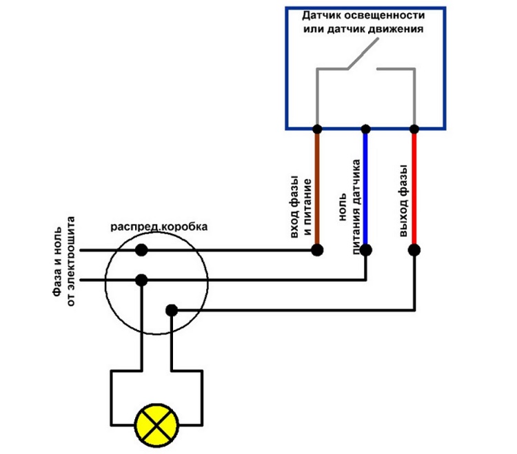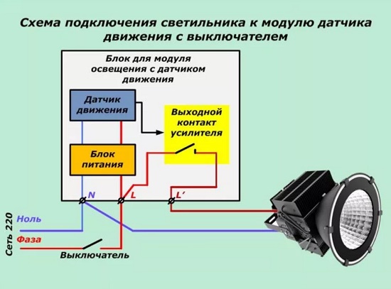 Un interrupteur est connecté au conducteur de phase d'entrée et de sortie du capteur - ainsi, une branche du réseau électrique est créée en contournant la section principale. Maintenant, en utilisant l'interrupteur, vous pouvez allumer l'éclairage, qui ne dépendra pas de l'activité motrice dans la zone contrôlée.