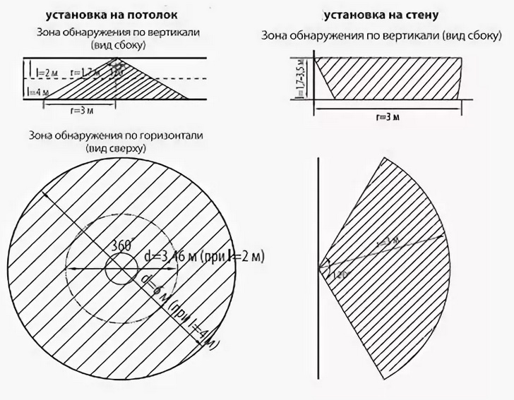 Les capteurs peuvent avoir une vue limitée et circulaire, avoir différents angles d'observation horizontale et verticale. Les appareils muraux contrôlent la zone selon un angle de 110–120 ° ou 180 ° horizontalement et 15–20 ° verticalement.