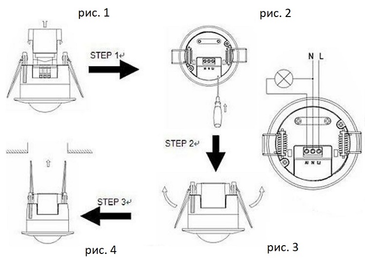 Pour installer un capteur à distance dans le plafond, le mur ou le boîtier de la lampe, vous devez introduire l'appareil dans le trou préparé, visser le boîtier sur la surface de montage à l'aide de vis autotaraudeuses. Ensuite, vous devez couper l'alimentation secteur et connecter la phase et le conducteur neutre du câble d'alimentation aux bornes conformément au schéma.
