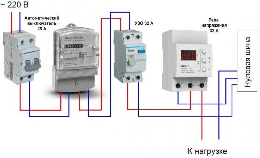 Dans le blindage, le relais de tension est toujours installé après le compteur dans le fil de phase ouverte. Il doit contrôler et, si nécessaire, couper précisément la "phase". Vous ne pouvez pas le connecter d'une autre manière.