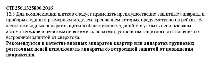 Cependant, vous reprocher est inutile. Après tout, même une protection PUE contre une tension accrue, la surtension dans les réseaux domestiques ne fournit pas. Bien que, SP 256.1325800.2016, ce problème soit passé à l'état "recommandé" pour les groupes de prises (ampoules, les développeurs du document "ont laissé" griller). Capture d'écran du paragraphe 12.3 SP - jointe.
