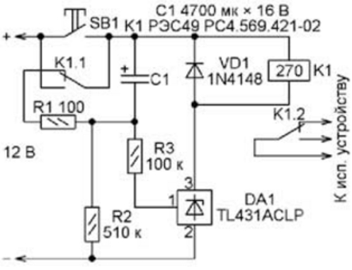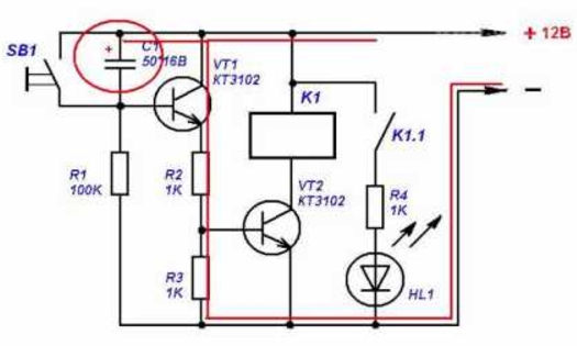 Le principe de fonctionnement des éléments du relais temporisé sur une clé à transistor: