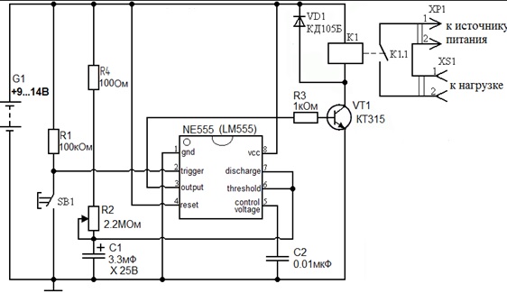 Une autre option est l'utilisation du "timer intégral" NE555. Dans ce cas, le retard est également déterminé par les paramètres des deux résistances (R2 et R4) et du condensateur (C1).