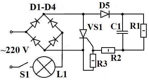 Pendant ce processus, le thyristor VS1 reste ouvert. En conséquence, la charge L1 reçoit une tension secteur de 220 V. Après la fin de la charge C1, le thyristor se ferme et coupe le courant, éteignant la lampe.