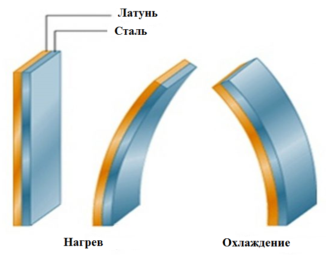 Une telle liaison rigide est assurée par soudage ou laminage à chaud. Du fait que la plaque est fixe immobile, lorsqu'elle est chauffée, sa flexion vers l'élément avec un coefficient de température plus faible est observée. Ce principe est pris comme base lors de la création relais thermiques.