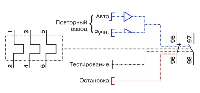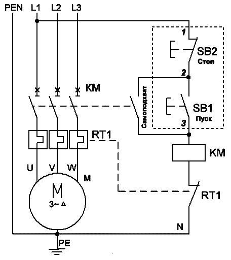 La désignation des bornes des contacteurs dicte GOST: normalement fermé - 95-96, normalement ouvert - 97-98. Un démarreur est connecté à la première paire, le second est utilisé pour les circuits de signalisation.Le moteur et le relais thermique devant être protégés contre les courts-circuits, le circuit doit contenir un disjoncteur.