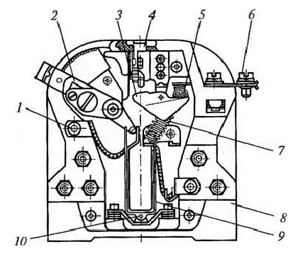 Pour coordonner le courant de consigne, la plaque bimétallique est connectée avec son extrémité gauche à son mécanisme. L'ajustement se produit en raison de l'effet sur la déformation primaire de la plaque.