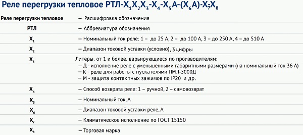 Les dispositifs de protection sont sélectionnés en fonction de la valeur de la puissance du moteur électrique. La partie principale des caractéristiques clés est cachée dans le symbole.