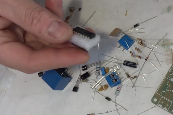 Tout d'abord, vous devez préparer les éléments de travail pour assembler l'appareil. Ce sera une carte, un microcircuit, des transistors, des relais, des condensateurs, des LED, des photocellules et d'autres accessoires.