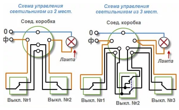 Une autre telle technique de contrôle de l'éclairage est applicable lors de la montée des escaliers, dans un garage attenant (entrée de la maison, sortie par le portail et vice versa). Un interrupteur supplémentaire près de la zone de couchage ne deviendra pas un excès si la pièce est assez longue.