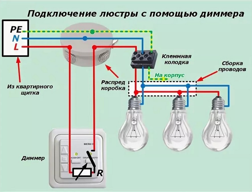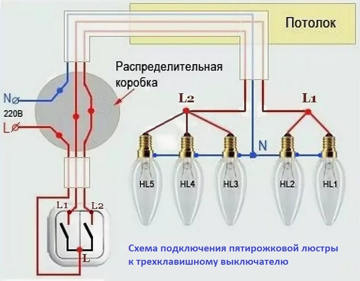 Pour surprendre les invités, vous pouvez connecter un lustre à cinq bras via un interrupteur à trois touches. Certes, une petite modification aux bornes de la lampe elle-même sera nécessaire. À partir d'un groupe de câblage à trois lignes, une doit être déconnectée et utilisée indépendamment.