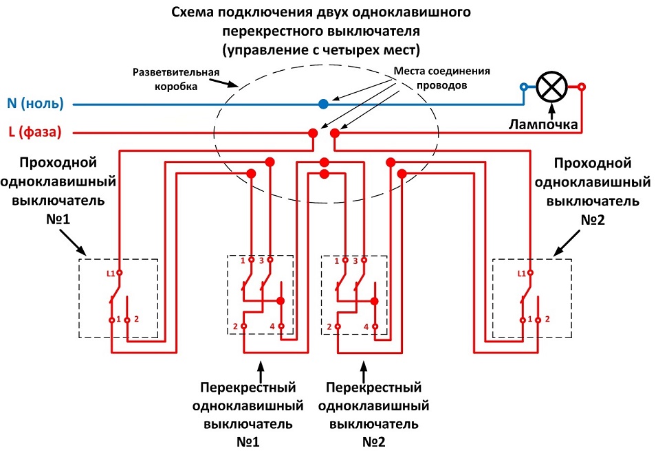 Pour contrôler le luminaire à partir de plus de deux centres, en plus du passage, des interrupteurs simples de type croisé sont nécessaires. Chaque nouveau point - un à la fois.