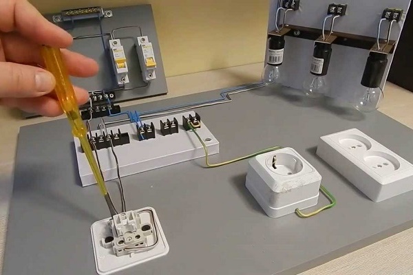 Assurez-vous que la tension sur les contacts exposés des appareils électriques et du câblage existants est absente, elle est nécessaire immédiatement avant le travail. La façon la plus simple de le faire à la maison est de tournevis indicateur, dont l'état de santé peu de temps avant le test est vérifié à partir du réseau de travail.