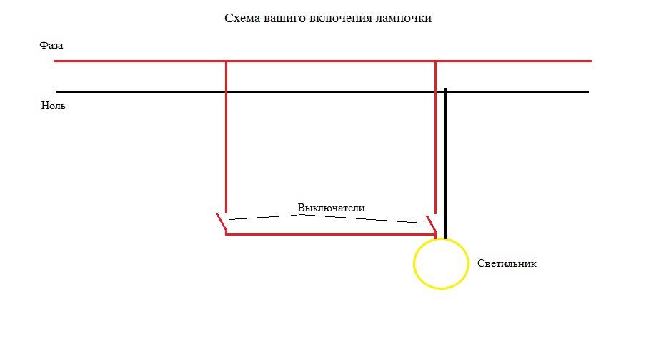 Bonjour, Sergey. Je suppose que votre ampoule est «contrôlée» par une interruption de phase par des interrupteurs à clé unique ordinaires. Les phases y sont résumées à partir de différentes boîtes de jonction (j'ai attaché le circuit à la réponse).