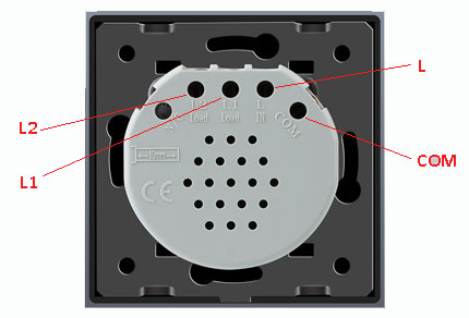Le contact "COM" est utilisé pour la communication entre les commutateurs dans la construction de circuits complexes. Par exemple, avec contrôle de trois points ou plus par plusieurs zones d'éclairage. Dans ce cas, une puissance de charge ne dépassant pas 1 kW est autorisée pour une zone d'éclairage.