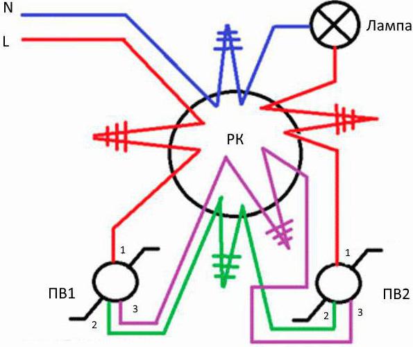 Le câblage de l'interrupteur de passage implique la création de trois lignes de travail, dont l'une est commune, et les deux autres sont croisées. Il devient ainsi possible de contrôler une section du circuit électrique à partir de différents points.