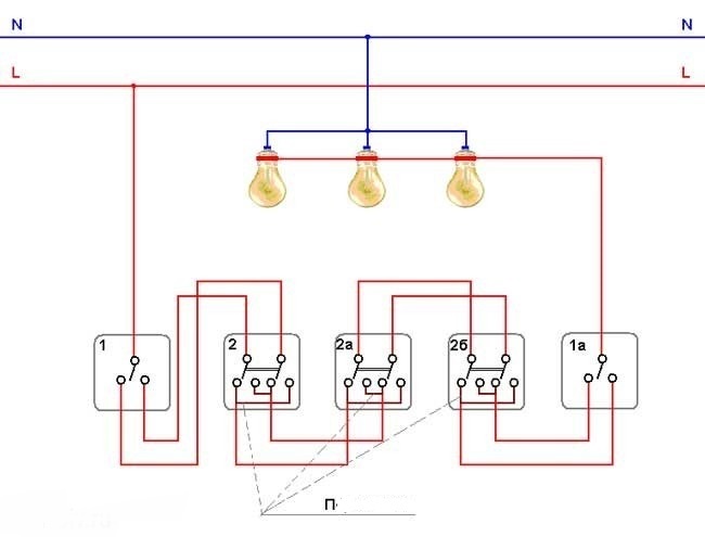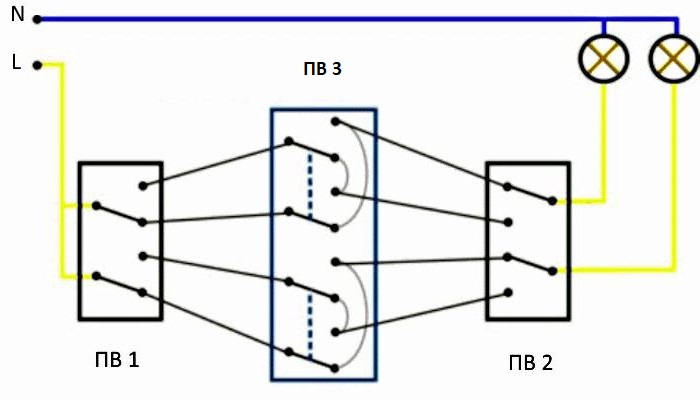 Les contacts inverseurs de numérotation (P) des deux interrupteurs, identiques en numérotation, sont reliés entre eux par des conducteurs. Les premiers contacts (commun - commun) des deux appareils sont connectés - l'un avec un fil de phase, le second avec un "zéro" à travers la lampe.