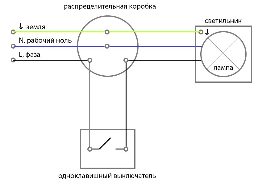 Considérez trois schémas de connexion de commutateur qui sont similaires dans la conception (ont une clé), mais diffèrent dans le type d'installation. De plus, toutes les options sont unies par la loi fondamentale de l'introduction de modèles à clé unique: un élément dynamique ouvre la "phase" et non le "zéro". Dans le cas contraire, il existe un risque de blessure lors des travaux de réparation et même avec un simple remplacement de lampe.