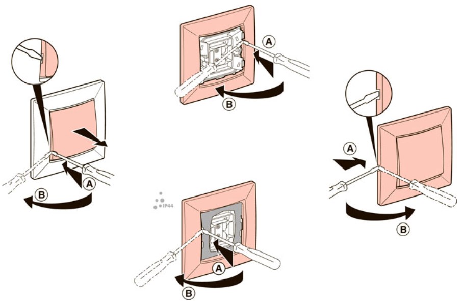 Étape 2. Retirez délicatement le cadre décoratif. Pour ce faire, poussez les loquets qui le maintiennent. Maintenant, l'avant du mécanisme de commutation est disponible pour inspection.
