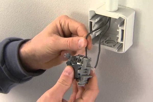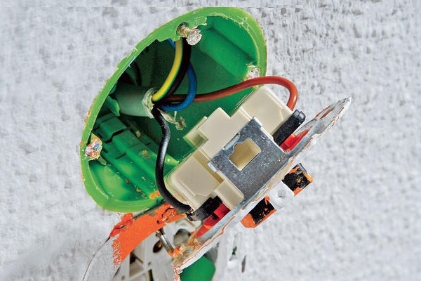 Déconnectez la pièce. Au lieu d'installation de l'interrupteur, nous apportons les fils, en les posant dans des stroboscopes préparés à l'avance. Peut maintenant installer une prise et le câblage à l'intérieur.