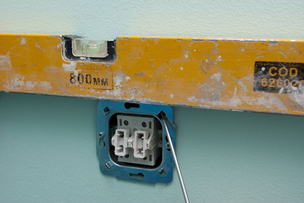 En utilisant le niveau, nous vérifions son horizontal, sinon nous ne pourrons pas installer uniformément le commutateur. Après cela, nous appliquons à nouveau la plaque au mur et marquons les points de fixation.