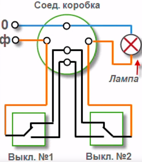 - Dans la boîte de jonction, nous connectons la phase du luminaire au fil de phase du deuxième interrupteur traversant.