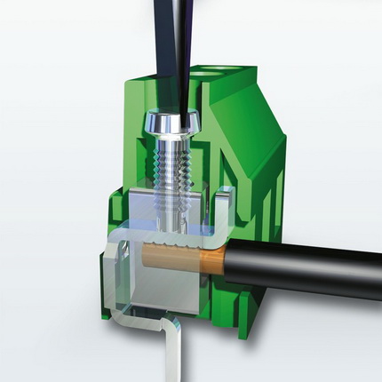 Représente le contact avec une plaque de serrage. Il est équipé d'un bouton spécial qui ajuste la position de la plaque. Le fil est dénudé de 1 cm, après quoi il est inséré dans le trou de contact et serré. L'ensemble de la procédure est très rapide et facile.
