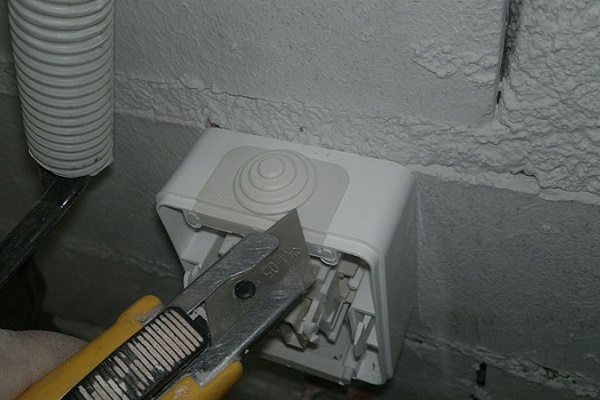 Le plus souvent, les prises de ce type ont un bouchon sur un côté du boîtier, sur lequel se détachent plusieurs trous possibles de différents diamètres. Dans ce cas, il ne reste qu'avec un couteau bien aiguisé ou un cutter pour retirer la fiche souhaitée et obtenir un trou pour le fil.