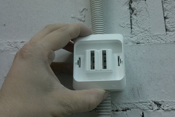 Nous insérons des chevilles dans les trous résultants, les soi-disant bouchons en plastique, qui fournissent des vis autotaraudeuses avec une bonne adhérence au mur. Ensuite, nous fixons le mécanisme de la sortie à la base et le fixons solidement avec des vis ou des vis autotaraudeuses. Vérifiez la qualité du montage résultant. La durabilité et la fiabilité de la nouvelle prise dépendent de sa force.
