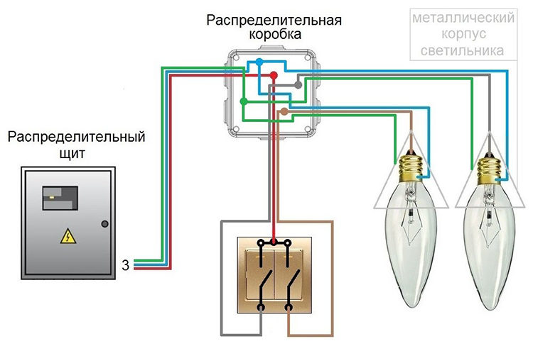 Lorsque deux fils de phase sont acheminés de la clé à deux touches à la lampe, ils sont connectés tour à tour - chacun à sa propre lampe. De la boîte de distribution, deux conducteurs nuls sont également étirés - ils sont également dispersés sur différentes lampes.