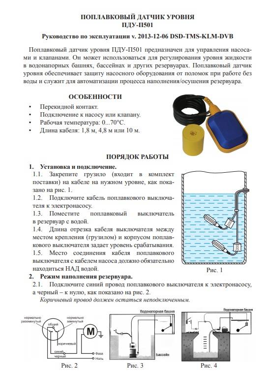 Un appareil correctement connecté surveille le fonctionnement des éléments de communication et allume ou éteint la pompe lorsque le niveau autorisé d'eau ou d'autre liquide dans le système change. Il est situé dans divers réservoirs de stockage, conteneurs, réservoirs, puits, etc.