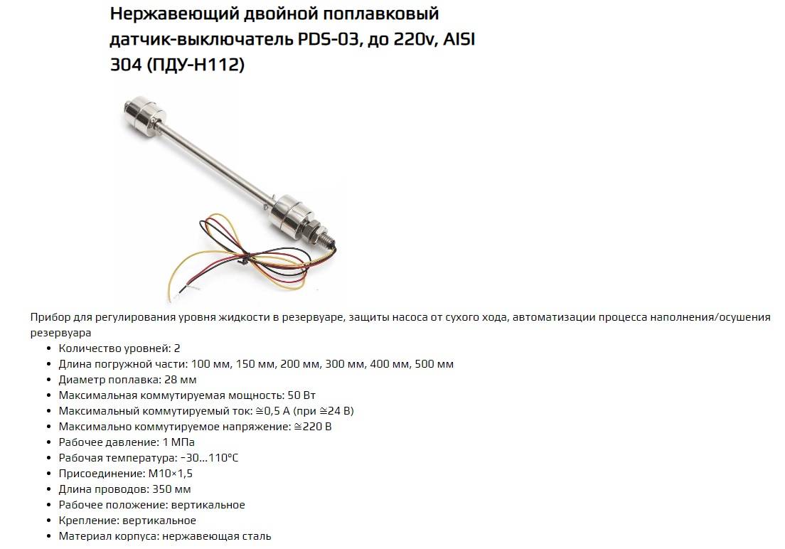 La plage de température des interrupteurs à flotteur est assez large. Pour cette raison, pour la prise d'eau d'un puits ou d'un puits station de pompage vous pouvez choisir l'unité qui convient le mieux aux tâches dans tous les autres paramètres.