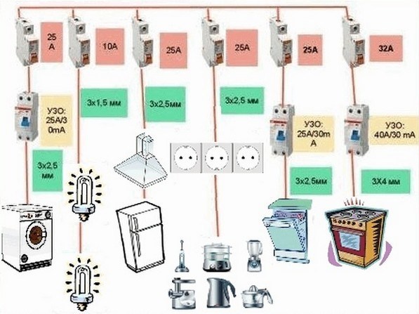 S'il est nécessaire de connecter chacun de ces consommateurs, le point alimenté doit résister à un courant nominal de 16 à 32 A. Pour un courant avec le même indicateur, il est conçu et placé à l'entrée disjoncteur.