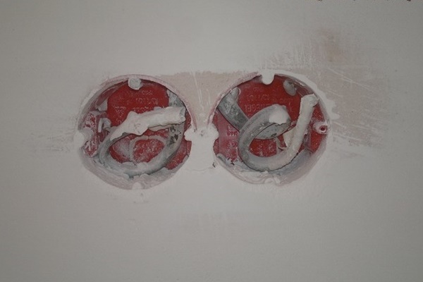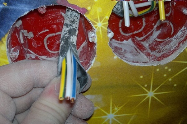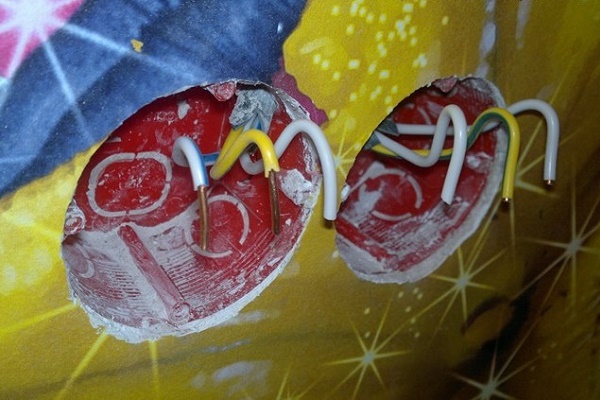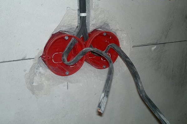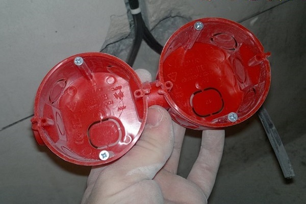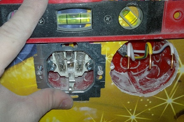 - Une prise avec des fils connectés est insérée dans une niche murale et fixée avec des pinces latérales.