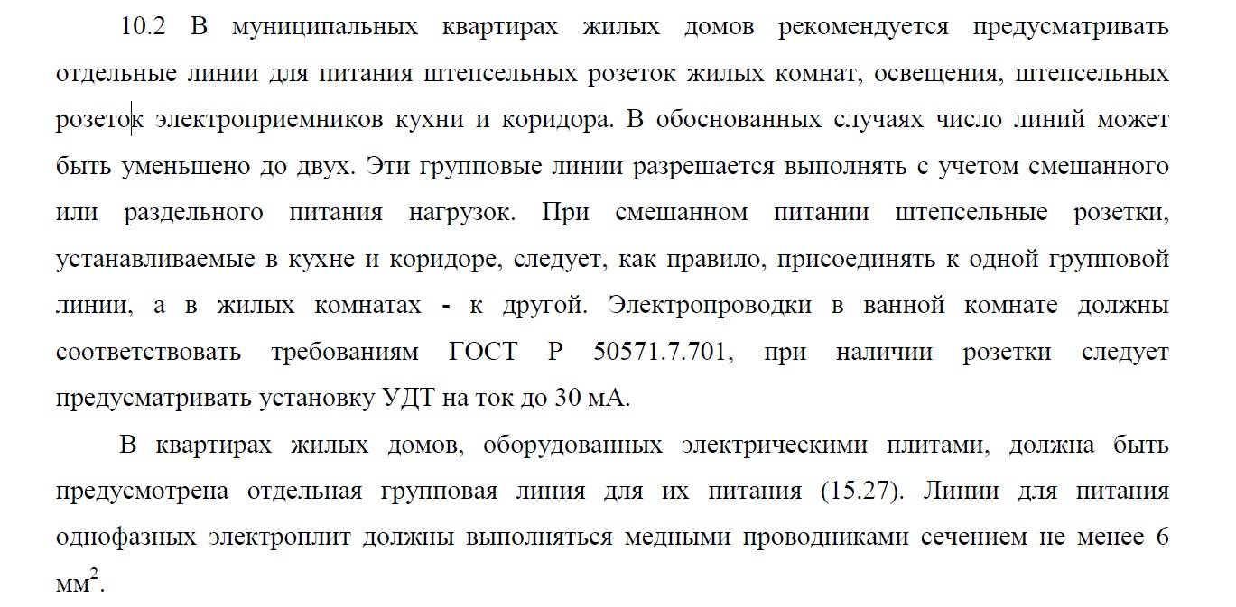 Soit dit en passant, les documents directifs (PUE, SP) recommandent d'allouer des groupes de charges de pièce, d'éclairage et de machines à laver, des cuisinières électriques avec des lignes séparées. Une capture d'écran du paragraphe correspondant SP 31-110-2003 - ci-joint.