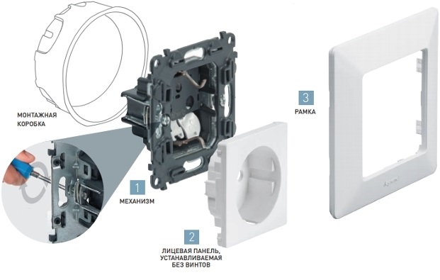 Les prises et interrupteurs sont fiables grâce à des pinces éprouvées. Ils maintiennent fermement les attaches même lors de la création de charges lourdes. L'installation d'interrupteurs et de prises, réalisée par une entreprise française, ne sera pas difficile. L'installation peut être effectuée à l'aide de vis ou de «pieds» de montage. Tout est accessible et compréhensible.